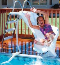 Swimming pool slides are available in many sizes and shapes, to accommodate almost every swimming pool and pool budget. Pool slides are typically made of fiberglass, and sometimes include a fitting to run water down the surface of the slide and keep swimmers sliding quickly into the pool. The water supply to the slide is either a garden hose, or the pool slide includes a hose to connect to the return line fitting of the swimming pool. A slide is an excellent addition to any In-Ground swimming pool, however local or national codes exist concerning the depth of the swimming pool where swimmers will land coming off the slide. If local codes do not exist, the suggestions of the NSPI (National Spa and Pool Institute) should be followed. A swimming pool slide should be permanently secured next to an In-Ground pool with bolts in the concrete deck.