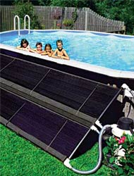 Another method of heating a swimming pool, which has absolutely no operating costs, is solar pool heating. Solar pool heat involves plumbing the swimming pool water through several solar heating panels. The sun warms these solar heating panels, and the pool water absorbs the warmth as it passes through the panels. Solar panels are relatively inexpensive to purchase, and are very simple to install. With no moving parts and generally sturdy construction, solar pool heat is a great choice for any pool owner in a moderate to warm climate with a good deal of direct sunlight.